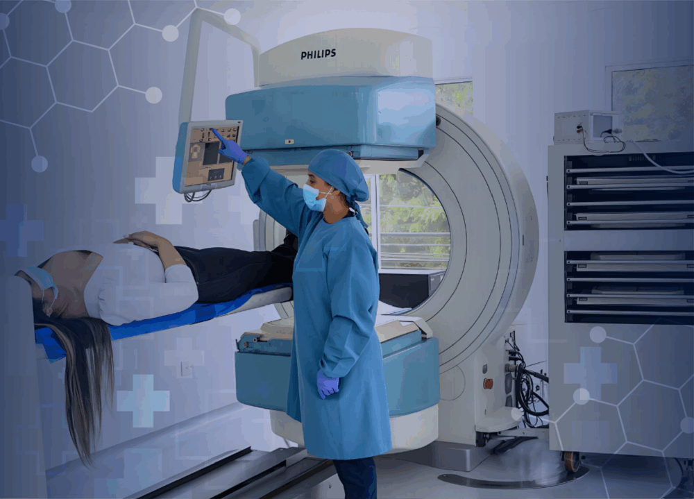 Scintigraphy (also known as nuclear medicine scans) are diagnostic imaging studies that use safe radiopharmaceuticals to obtain detailed images of organs and tissues. The procedure involves injecting or administering a small amount of a radiopharmaceutical, which emits signals detected by a gamma camera. It is a painless, non-invasive process that typically lasts between 30 minutes and 2 hours, depending on the specific study.